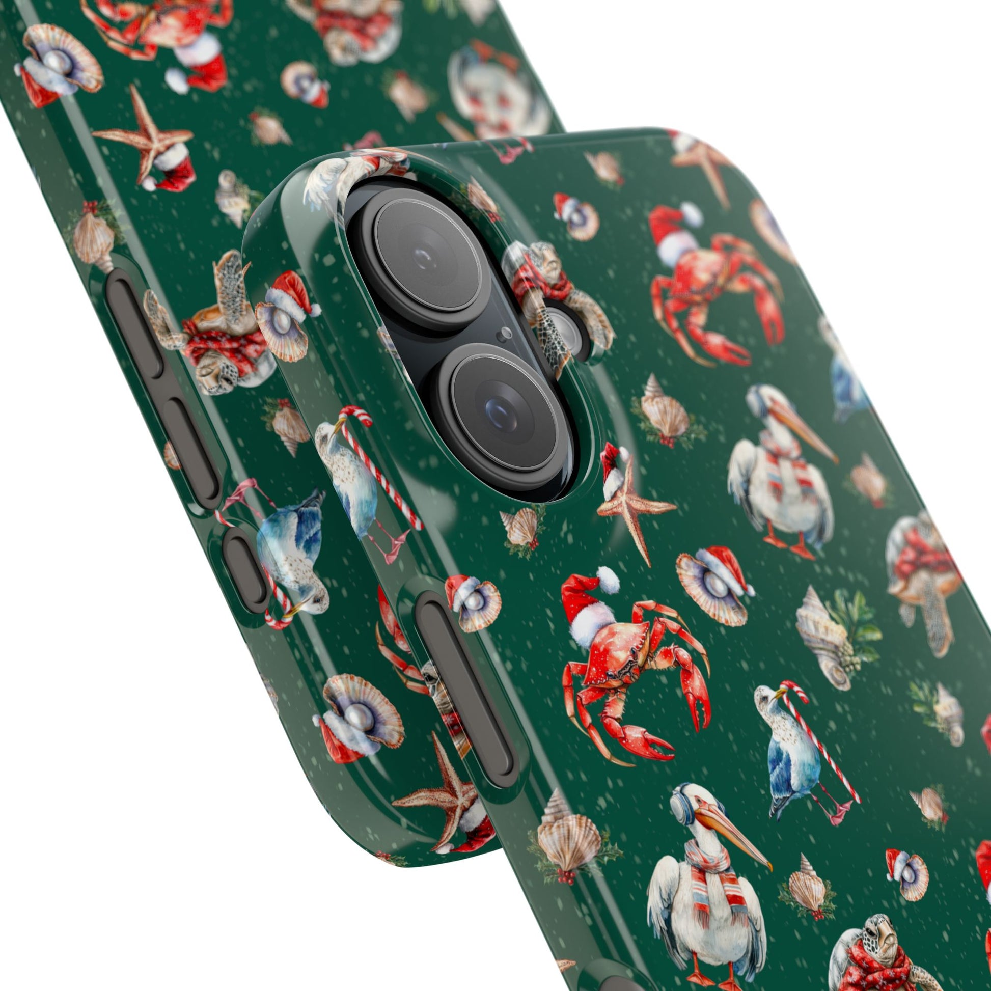 A phone case decorated with a pattern of coastal sea birds and shellfish dressed for the holidays with hats and scarves. It brings a cheerful holiday vibe to your phone while providing protection. Perfect for bird lovers and those who enjoy coastal themes. Ideal for Christmas, New Year's, and winter holiday celebrations.